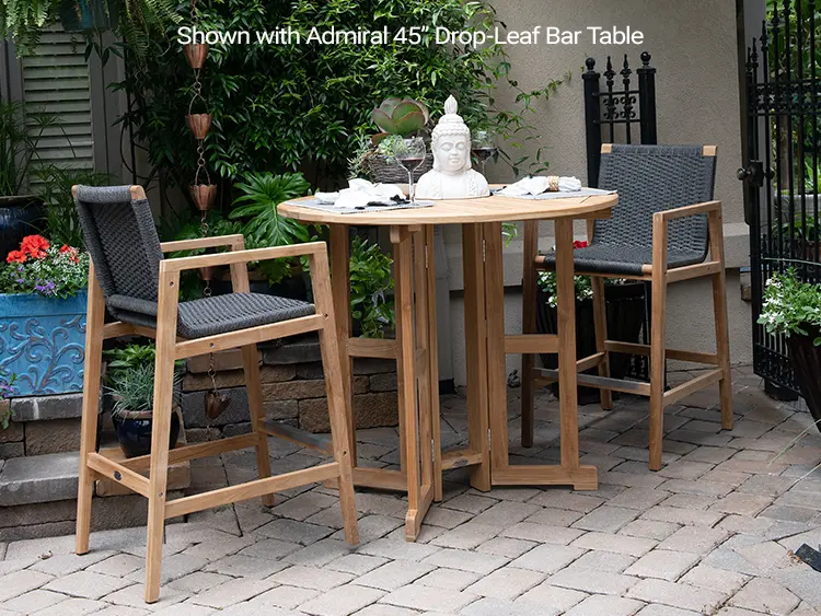 The Admiral Bar Chair is a very comfortable contemporary teak chair wrapped with synthetic rope. High end features such as “finger Joints” in armrest. Very sturdy and well-suited for both residential and commercial use. All Stainless-steel hardware. Rope material is made from high quality synthetic wicker, covered in a 16-spindle acrylic nylon sock, to maximize strength for outdoor use for decades.