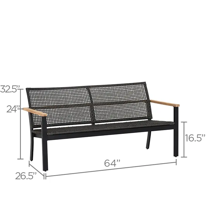 Sleek and Modern seating group featuring a sturdy black powder coated aluminum frame, handwoven all weather rope and warm teak finish accents. This set blends contemporary style with durable comfort.